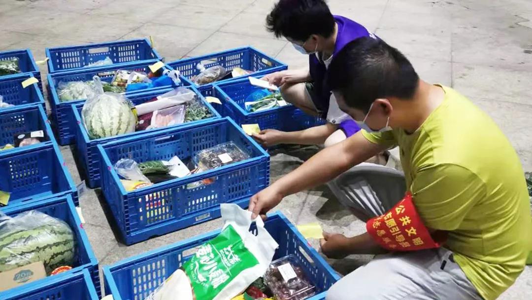 ▲ 環(huán)保二支部黨員裴碧濤下沉觀瀾社區(qū)為居民發(fā)放生活物資